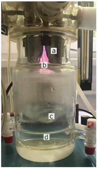 PAW was prepared in an electrically insulated cylindrical device made of Pyrex glass (the plasma treatment reactor), where two metal electrodes with divergent profiles were placed (Figure 5); the useful electric discharge occurs between these electrodes. The average value of the power used to prepare the water was calculated at 111.6 W.