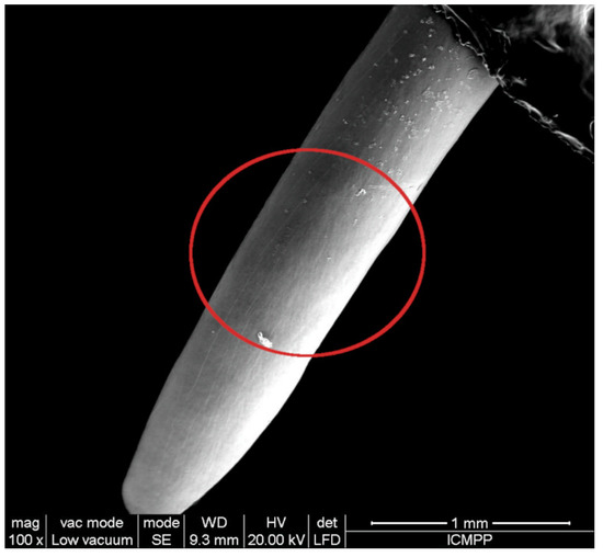 The micro-morphology of mice teeth was investigated with a Quanta 200 scanning electron microscope (SEM, FEI Company, Czech Republic), working at 20 kV in low vacuum mode, with a large field detector (LFD). The mice teeth were placed on aluminum stubs with double-sided adhesive carbon tape and were analyzed without any coating in order to preserve the morphology intact. For the energy-dispersive X-ray analysis (EDX), the microscope was equipped with a specific detector and the compositional characterization was evaluated with the corresponding EDAX Genesis software (Ametek, Berwyn, PA, USA). The analyzed area was in the middle third of the lingual surface of the teeth (Figure 6).