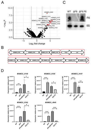 RNA-seq of the wt and ΔF6 strains. (A) Volcano plot of differentially expressed genes (DEGs) constructed using Enhanced Volcano R package [24]. Fold changes of gene expression were plotted. Significant DEGs were identified by >four-fold change (log2 FC > 2) and <0.05 FDR, and are shown in red. (B) Schematic representation of the gene clusters upregulated in the ΔF6 strain. (C) Northern blotting analysis of F6 transcription in the wt, ΔF6, and F6 complemented (ΔF6:F6) strains. (D) Validation of DEGs by qRT-PCR. mRNA expression was determined in the wt, ΔF6, ΔF6:pMV306, and ΔF6:F6 cultures in the mid-log phase and normalized to that of 16S rRNA. * p < 0.05, ** p < 0.01, and *** p < 0.001. The data are presented as the mean and SD of three biological replicates for each strain.