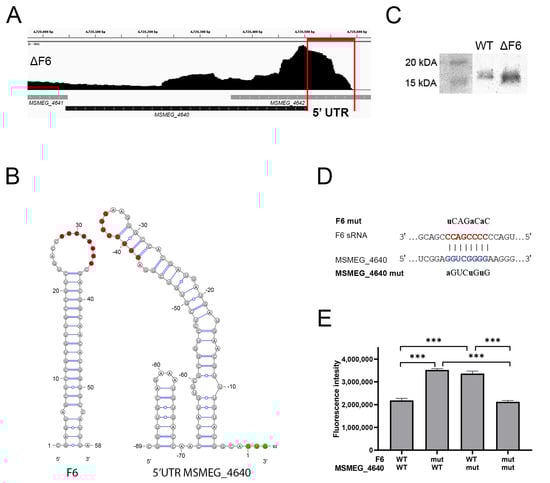 To identify mRNA targeted by F6, we selected potential targets using the CopraRNA prognostic software (http://rna.informatik.uni-freiburg.de, accessed on 20 May 2019), and compared the list of targets with that of DEGs according to RNA-seq. The only gene present in both lists was MSMEG_4640. F6 deletion caused the upregulation of MSMEG_4640 at both the mRNA and protein levels, which was confirmed by qRT-PCR (Figure 2D) and Western blotting (Figure 3A) of wt and ΔF6 cells.