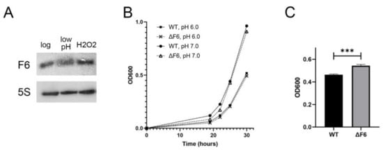 Effects of oxidative and acidic stresses on the M. smegmatis ΔF6 and wt strains. (A) F6 transcription in the mid-log growth phase and under acidic (low pH) and oxidative (H2O2) stresses was analyzed by Northern blotting. (B) Growth at neutral (pH 7) and acidic (pH 6) conditions. (C) Growth under oxidative stress (0.5 mM H2O2) at eight hours after H2O2 addition. The data are presented as the mean ± SD of three independent experiments; *** p < 0.001.