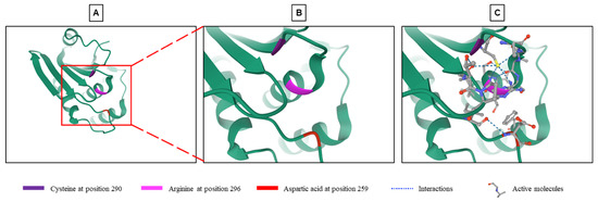 Structure of the phosphatase active site of DUSP9. (A) Crystallographic representation of the phosphatase site of DUSP9 with a focus on its catalytic part (see region of interest in red box) composed of a cysteine at position 290, an arginine at position 296 and an aspartic acid at position 259 (from RCSB Protein Data Bank: https://www.rcsb.org/3d-view/3LJ8, accessed on 1 September 2021) [45]. (B) Higher magnification of region of interest shown in panel A. (C) Same image than in Panel B with inserted substrates and molecular interactions between the three amino acyls and substrate.