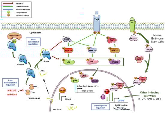 Regulation of DUSP9 expression and connection with MAPK pathways. Following the activation of tyrosine kinase receptors (TKR), MAPK pathways are activated through the successive phosphorylations of MAPKKKs (among which ASK1), MAPKKs MKK3/6, MKK4/7 and MEK1/2, and MAPKs p38, JNK and ERK. Phosphorylated MAPKs translocate to the nucleus and induce expression of the downstream targets c-FOS, ERG1, NANOG and HIF1, among others. In murine embryonic stem cells, the binding of BMP4 on its receptor induces the phosphorylation of Smad1/5, which then associates with Smad4. The Smad1/5–Smad4 complex translocates to the nucleus, binds the DUSP9 promoter and induces its transcriptional expression. Transcription factors HIF1-α and ETS can also induce DUSP9 expression. Besides the BMP signal, mTOR, RAR-α and ERβ pathways can also potentiate the transcription of the DUSP9 gene. Following NANOG binding on LINCU promoter, the long non-coding RNA LincU is transcribed and exported in the cytoplasm where it associates with DUSP9 and stabilizes it. Stable DUSP9 can dephosphorylate its substrates, including ERK1/2, p38, JNK and ASK1. In the absence of LincU RNA, DUSP9 protein is unstable and is polyubiquitinylated before its degradation by the proteasome. DUSP9 can also be post-transcriptionally regulated by miR-212 and miR-1246, which target the 3′-untranslated region of its mRNA. In summary, DUSP9 expression is tightly regulated by transcriptional, post-transcriptional and post-translational mechanisms.