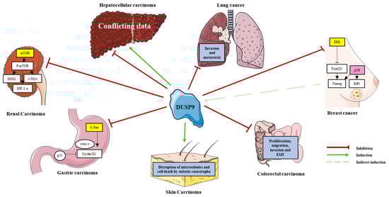 DUSP9 is implicated in many types of cancer (Table 2; Figure 3). It was identified by the Walktrap algorithm as an HCC-associated gene and a potential target for therapeutic research because of its interaction with MAPKs and the proto-oncogenes JUNB and FOSB [68]. However, its mechanistic role in cancer is unclear and seems context-dependent. In this section, we summarize the main data gathered from the literature on the role of DUSP9 in cancer.