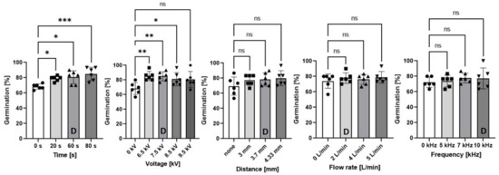 Germination rate results of plasma-treated Arabidopsis seeds from the parametric study. Germination was measured at 48 h with seeds grown on water agar in continuous light conditions at 23 °C with 65% RH. Experiments are an average of triplicates performed twice independently, for a total of 6 replicates. Asterisks denote statistical significance where * signifies p < 0.05; ** is p < 0.01; and *** is p < 0.001. The “ns” indicates “not significant”. The label “D” in each graph denotes the default parameter value.