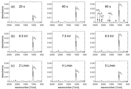 FTIR spectra of the plasma for different values of (a) plasma treatment time; (b) SDBD peak-to-peak voltage; and (c) air flow rate, plotted at the moment of maximum absorbance. Longer plasma-treatment time and higher voltage both increase the ozone concentration, whereas a higher flow rate decreases the ozone concentration, as expected. The species identified are labelled in the top right-hand graph; O3ov indicates overtones of ozone, and “w” indicates non-gaseous compounds, which are tentatively attributed to surface reactions on the KBr windows.