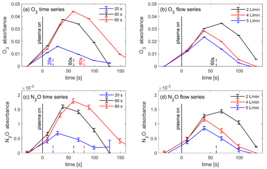 Time-dependent absorbance measurements of O3 and N2O from the series of treatment times (20, 60, and 80 s plasma duration) and flow rate (2, 4, and 5 L/min). The densities of both molecules increase with the plasma treatment time, and decrease with the air flow rate, as expected. The O3 and N2O molecules follow similar trends for each series. The measurements for the default parameters are shown in black.
