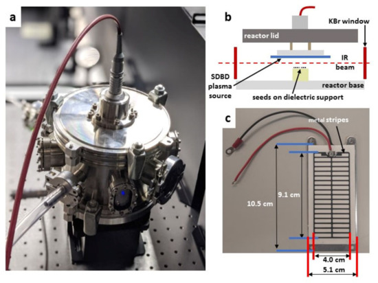 Figure 4a shows the airtight stainless steel reactor chamber, with an 18 cm diameter and 11 cm high, used to confine the SDBD air plasma and its gaseous products. The SDBD electrode assembly, shown in the photograph in Figure 4c from Sihon Electronics, comprises a high-voltage printed electrode in a stripe pattern on an alumina dielectric plate, placed on an aluminum ground electrode. The SDBD electrode power supply and high-voltage waveform are described in Section 4.4. The Arabidopsis seeds were placed on Teflon cylinders, several millimeters below the SDBD plasma, as shown schematically in Figure 4b. The infrared beam passes through the gap indicated by the dashed red line.