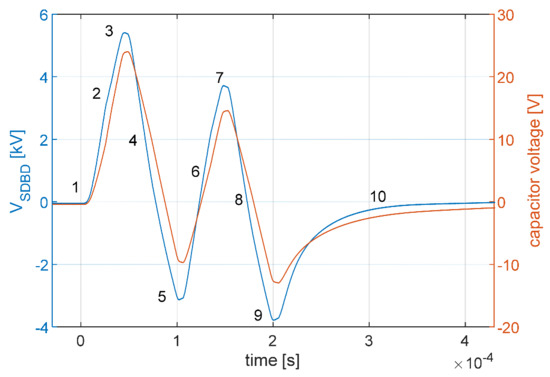 The voltage waveform of the SDBD plasma-seed treatment for nominal 8 kV peak-to-peak. The blue curve shows the voltage measured across the SDBD; the orange curve shows the voltage across the 68 nF series capacitor used to measure the charge on the electrode. The waveform distortion is caused by the transient response of the high-voltage amplifier when using high-frequency bursts. The numbers are used as references for Figure 6 to highlight specific key points.