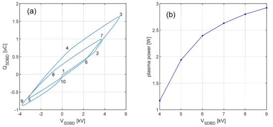The SDBD voltage and the capacitor charge deduced from Figure 5 were used to measure the power dissipated in the plasma using the Lissajous figure method [27]. Since the 2 cycles are not identical due to the transient distortion by the high-voltage amplifier, the resulting Lissajous figure shown in Figure 6a is not conventional. The locus is not a parallelogram because the waveform is not a continuous sinusoidal wave, but a burst whose voltage converges to 0 every 2 cycles. This produces the discontinuity at the origin visible in the figure. Nonetheless, the area within the locus of the voltage vs. charge contour for each cycle represents the energy per cycle dissipated in the plasma. Accounting for the 500 Hz modulation frequency of the burst, the time-averaged dissipated power for different voltages is shown in Figure 6b. The power was calculated to be 1.2–3 W for nominal voltages ranging from 4 to 9 kVpp. If the entire striped area of the SDBD is taken into consideration, the corresponding power density is 0.03–0.08 W/cm2.