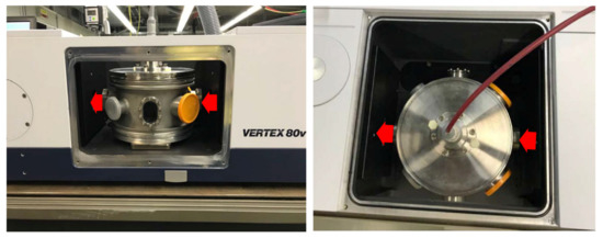 Side and top view photographs of the plasma reactor (see also Figure 4a) inside the sample compartment of the FTIR spectrometer, for in situ single-pass absorption measurements. The infrared passage through KBr windows is marked by the red arrows. The Faraday cage design of the reactor and its coaxial power supply cable protects against any possible electromagnetic perturbation to the FTIR instrument.