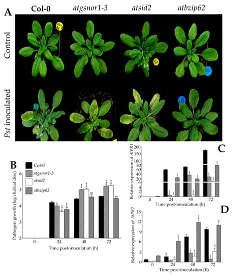 Generally, abiotic and biotic stress response mechanisms evolve a contrasting cellular metabolism and differential physiological processes, molecular functions, signaling pathways, and biochemical reactions [20,25]. Therefore, this study investigated the role of the AtbZIP62 TF in the defense mechanisms against the bacterium Pseudomonas syringae pv. tomato (Pst). To achieve that, we challenged the Arabidopsis mutant lines atbzip62 (lacking the AtbZIP62 gene) and Col-0 wild type (WT) with the Pst DC3000 virulent strain over time to assess the basal defense. Additionally, we explored the possibility for the AtbZIP62 to be associated with SAR and R-gene-mediated resistance toward the avirulent Pst DC3000 avrB strain. The Arabidopsis mutant line, atgsnor1-3 and atsid2, were included in the study as disease-susceptible controls.