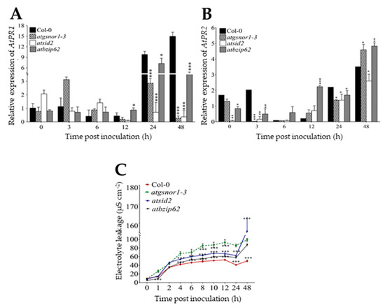 Transcript accumulation patterns of pathogenesis-related genes and electrolyte leakage results. Expression level over time of (A) AtPR1 and (B) AtPR2 in local leaf samples of Col-0 (WT), and atgsnor1-3, atsid2, and atbzip62 mutant lines in response to Pst DC3000 vir for R genes-mediated resistance soon after bacterial inoculation. (C) Electrolyte leakage measured over time. Data are the mean expression values in triplicate normalized to the relative expression of AtActin1. * p < 0.05; ** p < 0.01; *** p < 0.001; empty are nonsignificant.