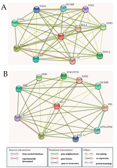 Prediction of the functional protein–protein interactome of selected pathogenesis-related genes. Predicted protein–protein interaction network involving the Arabidopsis (A) AtPR1 and (B) AtPR2 or BGL2 (proteins) with other pathogenesis-related protein-coding genes. The prediction was performed using the protein sequence of each target gene obtained from the Arabidopsis Information Resource (TAIR, www.arabidopsis.org (accessed on 9 October 2021)) and uploaded to STRING protein database version 11.5 (https://string-db-org/ (accessed on 9 October 2021)). Red nodes indicate the gene of interest, while other nodes represent the interactome of a different nature indicated by connecting lines. The nature of the interaction is indicated by specific line colors and the source of information (from curated databases, experimentally determined, predicted interactions, and others), as explained in the figure legend below the panel (B).