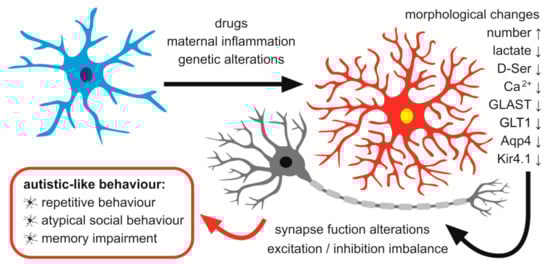 Ion homeostasis is a critical function of astroglia. Astrocytes regulate potassium ions and water flow in the extracellular space and between neuronal cells using inward rectifying K+ channels (Kir) for buffering K+ and water channels—Aquaporin4 (Aqp4)—needed for clearing the cellular debris by the glymphatic system [74]. Altered homeostasis of astrocytic water channels and K+ ions in the brain lead to altered balance between neuronal excitation and inhibition. Even small alterations in extracellular K+ concentration may produce hyperexcitability of neurons. Reduced Kir4.1 expression (but not other K+ channels) increases extracellular K+. Additionally, conditional knock-out of Kir4.1 depolarises glial membranes and inhibits potassium and glutamate uptake [75]. Furthermore, it has been shown that loss of water channels such asAqp4 present on astrocytes may lead to an impaired K+ buffering and consequently to increased excitation of neurons which underlies many neuropsychiatric disorders, including autism. The scheme depicting alterations in astroglia–neuron interactions (along with their probable causes) that possibly contribute to the development of autism is shown in Figure 2.