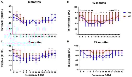 - DPOAE. At 6 months of age, no differences were observed in DPOAE thresholds between Coch−/− (n = 8) and Coch+/+ mice (n = 12) (Supplementary Table S1A) (Figure 1A). DPOAE measurements at 12 months of age demonstrate that thresholds of Coch−/− mice (n = 30) are significantly elevated compared to thresholds of Coch+/+ mice (n = 22) at all frequencies except for 12 kHz (Supplementary Table S1A) (Figure 1B). However, at 15 months of age, DPOAE thresholds in Coch−/− mice (n = 23) are only significantly elevated at a few frequencies (5 kHz, 6 kHz, 7 kHz, 24 kHz and 28 kHz) compared to Coch+/+ mice (n = 10) (Supplementary Table S1A) (Figure 1C). When mice reached the age of 2 years DPOAE measurements demonstrated no differences in thresholds between both groups (n = 5) except at 18 kHz (p = 0.017) (Supplementary Table S1A) (Figure 1D). These results indicate that Coch−/− mice develop temporary elevated DPOAE thresholds as they age but after two years, wildtype littermates had also elevated thresholds similar to Coch−/− mice.