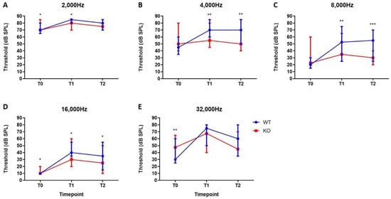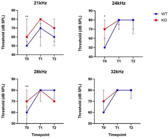 - DPOAE. Significant interactions between genotype and time were found in the noise exposure group at high frequencies (21–32 kHz) (Supplementary Table S2A). Post-hoc tests revealed that DPOAE thresholds were significantly elevated at 48 h post noise across all frequencies except from 6 kHz and 12k kHz in the Coch+/+ mice. One week after noise trauma thresholds remained significantly elevated at all these frequencies except at 10.5 kHz and 14 kHz (Supplementary Table S2B). In the Coch−/− group, hearing thresholds were significantly elevated at all frequencies after 48 h except at 6 and 7 kHz but one week after noise trauma thresholds recovered to normal values in the mid-frequency region (10–21 kHz) (Supplementary Table S2B). These results demonstrate that hearing thresholds of Coch+/+ did not recover following noise trauma while thresholds of Coch−/− mice recovered at all frequencies except for the low frequencies (5 kHz–9 kHz) and the high frequencies (24–32 kHz). Because of the early ARHL observed in Coch−/− mice, this group had significant higher thresholds than Coch+/+ mice at baseline measurements at the high frequencies (21 kHz–28 kHz). Forty-eight hours and one week after noise exposure, there were no significant differences between both groups (Figure 3).