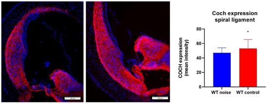 - Seist, R.; Landegger, L.D.; Robertson, N.G.; Vasilijic, S.; Morton, C.C.; Stankovic, K.M. Cochlin Deficiency Protects Against Noise-Induced Hearing Loss. Front. Mol. Neurosci. 2021, 14, 670013. [Google Scholar] [CrossRef]