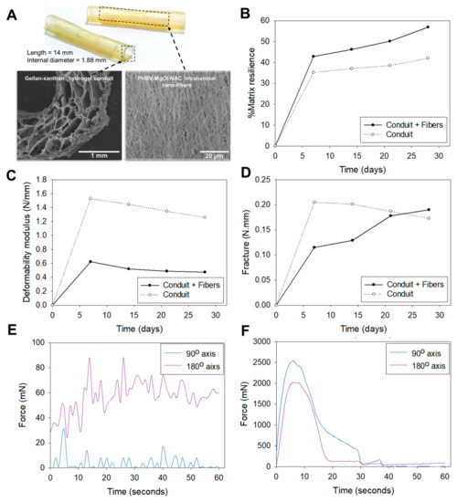 (A) Image of the BNRD comprising a gellan-xanthan hydrogel conduit with PHBV-MgOl-NAC intraluminal electrospun nanofibers. Mechanical profiles of hydrogel conduit over a 4 week study period conducted in PBS pH 7.4. (B) %matrix resilience, (C) deformability modulus, and (D) fracture. Biaxial mechanical profiles of hydrogel conduit and electrospun fibers are in dry state. (E) Tensile analysis of electrospun fibers and (F) tensile analysis of hydrogel conduit.