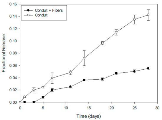 The 2.5-fold decrease in NGF release and its absence at days 1 and 3, resulting from the inclusion of intraluminal fibers, could be attributed to the entrapment of NFG molecules within the fibrous network upon its escape from the crosslinked hydrogel conduit. PHBV is an anionic polymer, whereas NGF, at pH 7.4, carries a positive charge; this potentiates ionic adhesion to the polymer chains. The Higuchi model, ascribed to NGF release from the conduit with intraluminal fibers, indicates the role of diffusion as a release mechanism of the peptide from the hydrogel conduit to the PHBV-fibrous network [29,30]. Polymer relaxation following erosion would be required for the peptide’s subsequent release from the fibrous network; hence, the Case-II relaxational mechanism was determined from kinetic modelling [30,31,32]. This type of delayed release and entrapment of NGF within the intraluminal guidance fibers could be favorable, as it decreases NGF wastage, its excessive leakage out of the conduit system, and the potential downregulation of TrkA receptors, leading to hindered axon regeneration. In this way, the released NGF molecules would be confined to the interior of the conduit lumen, where they would be readily available to the regenerating axons, as opposed to escape outside the conduit. Attached molecules of NGF on the surface of the PHBV fibers may enhance neuronal cell interaction and adhesion by improving the physical guidance ability of the fibers towards innervation of the target muscles. This effect functions as both a chemical cue and a therapeutic cue.