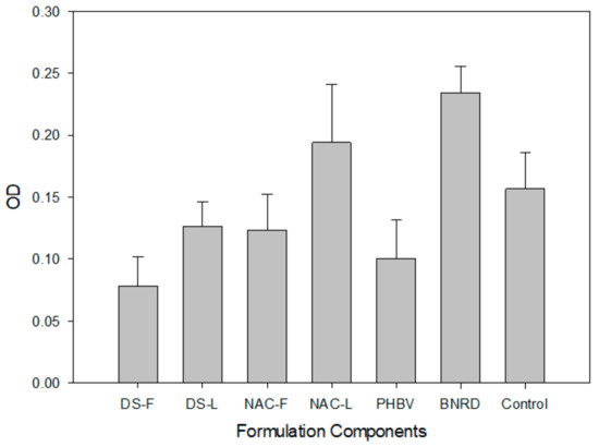 PC12 proliferation in response to the different scaffold components and the final assembled device was determined over 72 h (Figure 3) (p < 0.05). The DS-L hydrogel and the NAC-L fibers showed improved cell growth compared to the corresponding bioactive-free components (DS-F and NAC-F, respectively). The NAC-L fibers supported cell growth comparable to that of the control. Similarly, the final biosimulated nerve repair device (BNRD), comprising a DS-L conduit with NAC-L fibers, exceeded the growth of the control. The following individual components could not support the growth of PC12 cells compared to the control: DS-F, DS-L, NAC-F and pristine electrospun PHBV.