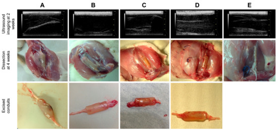 Images of ultrasound analysis, post-implantation and excised conduit of Groups (A–E).