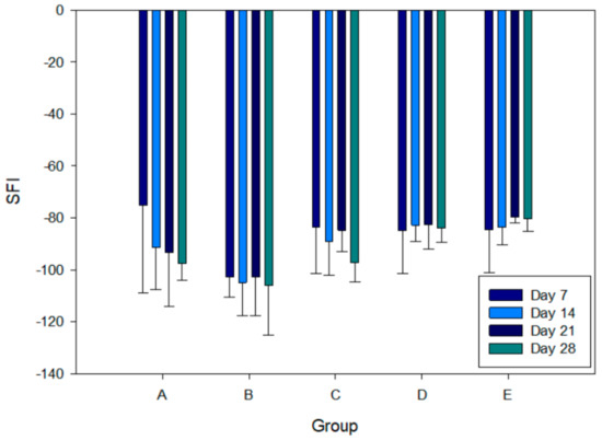 Sciatic function index determined from walking track analysis over 28 days for Groups A–E.
