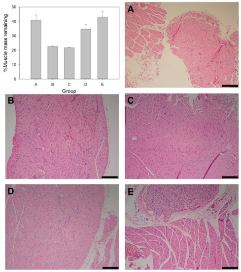 %Muscle mass remaining and histological images of gastrocnemius muscle tissue at 28 days in Groups (A–E) (Scale bar= 200 µm).