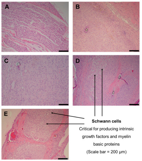 Histological analysis on the regenerated nerve segment at the mid-portion of the conduit at 28 days was performed to assess the degree of nerve regeneration (Figure 8). All specimens collected from Groups A–E demonstrated a mild inflammatory response. Group A presented with normal peripheral nerve tissue, increased cellularity from spindle and Schwann cell proliferation (Figure 8A). Karyopyknosis, an event leading to nuclear apoptosis, was noted. Group B showed axonal damage, the increased presence of spindle cells and granulomatous inflammation, which obscured the underlying peripheral nerve tissue; however, an interlaced formation of spindle cells represented reactive Schwann cells (Figure 8B). Inflammation consisting of lymphocytes, plasma cells and mast cells was present along the interstitium. Group C presented with extensive proliferation of interstitial cells and granulomatous inflammation consisting of epitheloid macrophages (Figure 8C). Group D presented with spindle cells, numerous capillaries, red blood cells, fibrin deposition and Schwann cells (Figure 8D), with granulomatous inflammation. Group E exhibited moderate interstitial cells, Schwann cell proliferation and neovascularization, accompanied by inflammation that consisted of lymphocytes, plasma cells and epitheloid macrophages (Figure 8E).