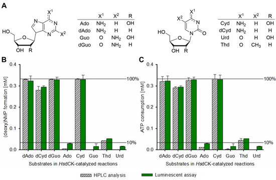 To validate the accuracy of the assay, NK reactions were performed with human deoxycytidine kinase (HsdCK), ATP as phosphate donor and eight natural (deoxy)nucleosides (Ado, dAdo, Guo, dGuo, Cyd, dCyd, Urd, Thd, Figure 2A) at 37 °C for 19 h. Afterwards, ATP consumption and NMP formation were analyzed using the luminescence-based assay and data were compared to standard HPLC analytics. Using the luminescence-based assay, NMP formation was calculated based on ATP consumption. The determined NMP formation (Figure 2B and Figure S2) and ATP consumption (Figure 2C and Figure S2) were very comparable for both methods used. The deviations between both methods were between 0.49 and 7.53% (Table S2), with the difference being highest at low (deoxy)NMP formation. For Ado, Guo, and Urd, there was up to 9% ATP consumption detected by the luminescent assay, while no or only very little NMP formation was observed by HPLC. The susceptibility of the assay to error has been observed previously []. In order to avoid false-positive results at conversions < 10%, it is therefore advisable to either (i) check product formation via HPLC or (ii) repeat the reaction with increased enzyme concentration to verify the substrate’s acceptance. In general, the assay should be used preferentially to find the best performing NK showing significant substrate conversion > 50%.