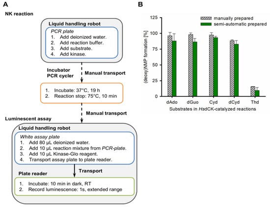 Semi-automated activity assay for nucleoside kinases. (A) The kinase reaction and the luminescent assay was automatically prepared by a liquid handling robot. A manual step was implemented to transport the reaction to an incubator and, after reaction complementation, back to the liquid handling robot. (B) HsdCK-catalyzed reactions with ATP as phosphate donor were manually and semi-automated prepared and analyzed using the luminescent assay. Mean of the duplicates and standard deviations are indicated.