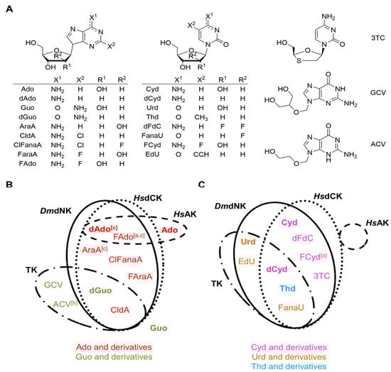 Although viral thymidine kinases are known to accept a broad spectrum of nucleoside analogues [], the tested TK displayed a narrower substrate spectrum compared to DmdNK or HsdCK (Figure 4B,C). The screening mainly revealed activities towards deoxy- or arabino-nucleoside substrates. Not only pyrimidines but also some purine nucleoside analogues were converted by TK, although to a much lower extent than by DmdNK and HsdCK. Interestingly, unlike DmdNK and HsdCK, TK phosphorylates the open-ring guanosine analogues GCV and ACV, which is in good agreement with literature data on viral TKs []. The ability of a viral TK to phosphorylate CldA and FanaU was shown for the first time in this study.