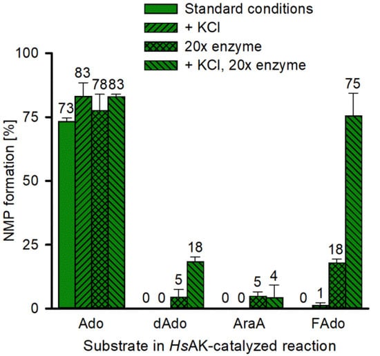 While the addition of 50 mM KCl, did not improve NMP formation, a 20-fold increase in HsAK led to an increased substrate conversion of dAdo, AraA, and FAdo (Figure 5). A combination of KCl addition and increased enzyme concentration further improved NMP formation for dAdo and FAdo. In accordance with literature data, no significant conversion of AraA was observed, which confirms the results by Yamada et al., who showed HsAK activity towards AraA to be max. 7% compared to Ado under optimized conditions [].