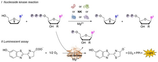 Principle of the luminescent assay. The residual phosphate donor from the nucleoside kinase reaction (I) is detected by a luciferase through a luminescence signal (II). B1 and B2—nucleobase; R—H or OH; Y—natural or modified sugar moiety.