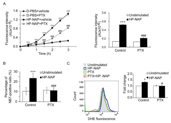 PTX-dependent inhibition of HP-NAP-induced ROS production in neutrophils and ATRA-induced differentiated HL-60 cells. (A) The inhibitory effect of PTX on HP-NAP-induced ROS production by neutrophils. Neutrophils at a density of 2 × 106 cells/mL were pretreated with 100 ng/mL PTX or the vehicle control at 37 °C for 3 h and followed by the stimulation with 1 μM HP-NAP or D-PBS, pH 7.2, as the unstimulated control at 37 °C for the indicated time. ROS produced by neutrophils was measured by H2DCF-DA-derived fluorescence assay as described in Materials and Methods. Data from neutrophils treated with HP-NAP for 1.5 h are shown as bar graph and expressed as mean ± SD of four independent experiments in triplicate. (B) The inhibitory effect of PTX on the number of ROS-producing cells in ATRA-induced differentiated HL-60 cells induced by HP-NAP. ATRA-differentiated HL-60 cells at a density of 4 × 106 cells/mL were pretreated with 100 ng/mL PTX or the vehicle control at 37 °C for 16 h and followed by the stimulation with 1 μM HP-NAP or D-PBS, pH 7.2, as the unstimulated control at 37 °C for 30 min. The number of ROS-producing cells was determined by NBT reduction assay as described in Figure 1A. Data are expressed as mean ± SD of six independent experiments. (C) The inhibitory effect of PTX on the level of ROS production in ATRA-induced differentiated HL-60 cells induced by HP-NAP. ATRA-induced differentiated HL-60 cells at a density of 4 × 106 cells/mL were pretreated with 100 ng/mL PTX or the vehicle control at 37 °C for 16 h and followed by the stimulation with 1 μM HP-NAP or D-PBS, pH 7.2, as the unstimulated control at 37 °C for 30 min. The level of ROS production was measured by monitoring the cell-derived DHE fluorescence using flow cytometry as described in Materials and Methods. The representative histogram is shown in the left panel. Data in the right panel are expressed as the fold change of the mean fluorescence intensity (MFI) by defining the MFI of DHE-derived fluorescence in the unstimulated control cells as 1 and as mean ± S.D. of three independent experiments. *: p value < 0.05, ***: p value < 0.001 as compared with unstimulated cells. #: p value < 0.05, ###: p value < 0.001 as compared with HP-NAP-stimulated cells.