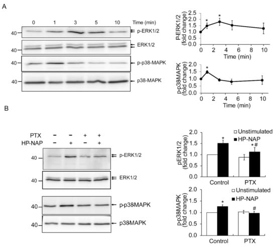 Involvement of PTX-sensitive G-proteins in HP-NAP-induced activation of ERK1/2 and p38-MAPK in ATRA-induced differentiated HL-60 cells. (A) HP-NAP-induced phosphorylation of ERK1/2 and p38-MAPK in ATRA-induced differentiated HL-60 cells. ATRA-induced differentiated HL-60 cells at a density of 2.5 × 106 cell/mL were stimulated with 1 μM HP-NAP or D-PBS, pH 7.2, as the unstimulated control at 37 °C for the indicated time. The cells were lysed and whole cell lysates were applied to immunoblot analysis for phospho-ERK1/2, ERK1/2, phospho-p38-MAPK, and p38-MAPK. Quantitative data are expressed as the fold change by defining the amounts of the phosphorylated proteins in unstimulated control cells as 1 and as mean ± SD of at least three independent experiments. (B) Effect of PTX on HP-NAP-induced phosphorylation of ERK1/2 and p38-MAPK in ATRA-induced differentiated HL-60 cells. ATRA-induced differentiated HL-60 cells at a density of 5 × 106 cell/mL were pretreated with 100 ng/mL PTX or the vehicle control at 37 °C for 16 h and followed by the stimulation with 1 μM HP-NAP or D-PBS, pH 7.2, as the unstimulated control at 37 °C for 3 min to examine the phosphorylation of ERK1/2 or 1 min to examine the phosphorylation of p38-MAPK. The cells were lysed and whole cell lysates were applied to immunoblot analysis as described in A. Quantitative data are expressed as the fold change described in A and as mean ± SD of three independent experiments. *: p value < 0.05 as compared with unstimulated cells with in each group; #: p value < 0.05 as compared with HP-NAP-stimulated control cells.