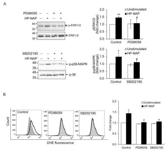 The effect of MAPK inhibitors on MAPK phosphorylation and ROS production in ATRA-induced differentiated HL-60 cells in response to HP-NAP. (A) The inhibitory effect of MAPK inhibitors on HP-NAP-induced MAPK phosphorylation in ATRA-induced differentiated HL-60 cells. ATRA-induced differentiated HL-60 cells at a density of 5 × 106 cell/mL were pretreated with 10 μM PB98059, 5 μM SB202190, or the vehicle control at 37 °C for 1 h and followed by the stimulation with 1 μM HP-NAP or D-PBS, pH 7.2, as the unstimulated control for 3 min to detect the phosphorylation of ERK1/2 or 1 min to detect the phosphorylation of p38-MAPK. Cells were lysed and whole cell lysates were applied to immunoblot analysis as described in Figure 3A. Quantitative data are expressed as the fold change as described in Figure 3A and as mean ± SD of four independent experiments. (B) The effect of MAPK inhibitors on HP-NAP-induced ROS production in ATRA-induced differentiated HL-60 cells. ATRA-induced differentiated HL-60 cells at a density of 4 × 106 cells/mL were pretreated with MAPK inhibitors or the vehicle control as described in A and followed by the stimulation with 1 μM HP-NAP or D-PBS, pH 7.2, as the unstimulated control at 37 °C for 30 min. ROS production was measured as DHE-derived fluorescence detected by flow cytometry as described in Figure 2C. Representative histograms are shown in the left panel. Gray filled histograms represent the unstimulated control cells and black open histograms represent the HP-NAP-stimulated cells. Data in the right panel are expressed as the fold change of MFI by defining the MFI of DHE-derived fluorescence in the unstimulated control cells as 1 and as mean ± SD of three independent experiments. *: p value < 0.05, **: p value < 0.01 as compared with the unstimulated cells in each group; #: p value < 0.05 as compared with HP-NAP-stimulated cells in the control group.