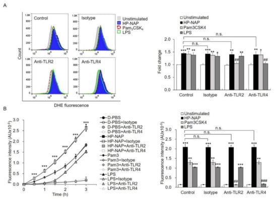 The effect of TLR2-neutralizing antibodies on HP-NAP-induced ROS production by ATRA-induced differentiated HL-60 cells and neutrophils. (A) TLR2-independent ROS production in ATRA-induced differentiated HL-60 cells induced by HP-NAP. ATRA-induced differentiated HL-60 cells at a density of 4 × 106 cell/mL were pretreated with 10 μg/mL of anti-TLR2, anti-TLR4, or IgG2a isotype antibodies at 37 °C for 30 min and followed by the stimulation with 1 μM HP-NAP, 1 μg/mL Pam3CSK4, 10 μg/mL LPS, or D-PBS, pH 7.2, as the unstimulated control at 37 °C for 30 min. ROS production was measured as DHE-derived fluorescence by flow cytometry as described in Figure 2C. Representative histograms are shown in the left panel. Data in the right panel are expressed as the fold change as described in Figure 2C and as mean ± SD of three independent experiments. (B) TLR2-independent ROS production in neutrophils induced by HP-NAP. Neutrophils at a density of 2 × 106 cell/mL were pretreated with 10 μg/mL of anti-TLR2, anti-TLR4 or IgG2a isotype antibodies at 37 °C for 30 min and followed by the stimulation with 1 μM HP-NAP, 1 μg/mL Pam3CSK4, 10 μg/mL LPS or D-PBS, pH 7.2, as the unstimulated control for the indicated time. ROS production by neutrophils was determined by H2DCF-DA-derived derived fluorescence assay as described in Figure 2A. Data from neutrophils stimulated with HP-NAP for 2.5 h are shown as bar graph and expressed as mean ± SD of four independent experiments in duplicate. *: p value < 0.05, **: p value < 0.01, ***: p value < 0.001 as compared with the unstimulated cells. ##: p value < 0.01, ###: p value < 0.001 as compared with HP-NAP-stimulated cells in the isotype control group. n.s.: non-significant.