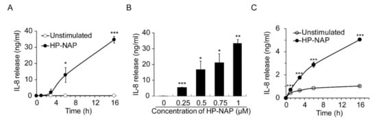 Time- and dose-dependent induction of IL-8 secretion by HP-NAP. (A,B) Time- and dose-dependent secretion of IL-8 from ATRA-induced differentiated HL-60 cells induced by HP-NAP. ATRA-induced differentiated HL-60 cells at a density of 1 × 106 cells/mL were stimulated with 1 μM HP-NAP or D-PBS, pH 7.2, as the unstimulated control at 37 °C for the indicated time (A) or stimulated with the indicated concentrations of HP-NAP (B) at 37 °C for 16 h. The amount of IL-8 release was measured from the culture supernatants by ELISA. Data are expressed as mean ± SD of four and three independent experiments for A and B, respectively. (C) Time-dependent secretion of IL-8 from neutrophils induced by HP-NAP. Neutrophils at a density of 2.5 × 106 cells/mL were treated with 1 μM HP-NAP and D-PBS, pH 7.2, as the unstimulated control at 37 °C for the indicated time. The amount of IL-8 release was determined as described in (A,B). Data are expressed as mean ± SD of four independent experiments. *: p < 0.05, **: p value < 0.01, ***: p < 0.001 as compared with the unstimulated cells.