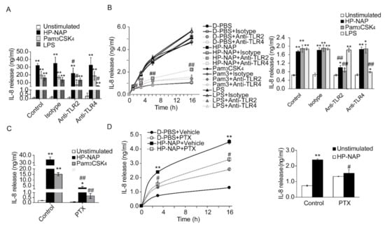 Involvement of TLR2 and PTX-sensitive heterotrimeric G proteins in HP-NAP-induced secretion of IL-8 by ATRA-induced differentiated HL-60 cells and neutrophils. (A) TLR2-dependent secretion of IL-8 from ATRA-induced differentiated HL-60 cells induced by HP-NAP. ATRA-induced differentiated HL-60 cells at a density of 2 × 106 cells/mL were pretreated with 10 μg/mL of anti-TLR2, anti-TLR4, or IgG2a isotype antibodies at 37 °C for 30 min and followed by the stimulation with 1 μM HP-NAP, 10 ng/mL Pam3CSK4, 10 μg/mL LPS or D-PBS, pH 7.2, as the unstimulated control at 37 °C for 16 h. The amount of IL-8 release was determined as described in Figure 6. Data are expressed as mean ± SD of four independent experiments. (B) TLR2-dependent secretion of IL-8 from neutrophils induced by HP-NAP. Neutrophils at a density of 5 × 106 cells/mL were pretreated with 10 μg/mL of anti-TLR2, anti-TLR4, or IgG2a isotype antibodies at 37 °C for 30 min and followed by the stimulation with 1 μM HP-NAP, 1 μg/mL Pam3CSK4, 10 μg/mL LPS or D-PBS, pH 7.2, as the unstimulated control at 37 °C for the indicated time. The amount of IL-8 release was determined as described in A. Data from neutrophils stimulated with HP-NAP for 3 h are shown as the bar graph and expressed as mean ± SD of four independent experiments. (C) PTX-sensitive secretion of IL-8 from ATRA-induced differentiated HL-60 cells induced by HP-NAP and Pam3CSK4. ATRA-induced differentiated HL-60 cells at a density of 2 × 106 cells/mL were pretreated with 100 ng/mL PTX or the vehicle control at 37 °C for 16 h and followed by the stimulation with 1 μM HP-NAP, 10 ng/mL Pam3CSK4, or D-PBS as unstimulated control at 37 °C for 16 h. The amount of IL-8 release was determined as described in A. Data are expressed as mean ± SD of three independent experiments. (D) PTX-sensitive secretion of IL-8 from neutrophils induced by HP-NAP. Neutrophils at a density of 5 × 106 cells/mL were pretreated with 100 ng/mL PTX or the vehicle control at 37 °C for 4 h and followed by the stimulation with 1 μM HP-NAP or D-PBS, pH 7.2, as the unstimulated control at 37 °C for the indicated time. The amount of IL-8 release was determined as described in A. Data from neutrophils stimulated with HP-NAP for 3 h are shown as the bar graph and expressed as mean ± SD of four independent experiments. *: p value < 0.05, **: p value < 0.01 as compared with unstimulated cells. #: p-value < 0.05, ##: p value < 0.01 as compared with stimulated cells in isotype control group or vehicle control group.
