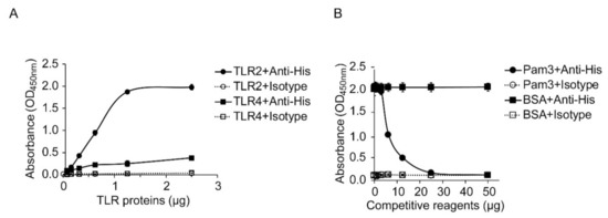The competitive ELISA was performed by the pre-incubation of 0.625 μg of the recombinant human TLR2-10xHis protein in 100 µL of PBS-T together with either Pam3CSK4 or BSA (Cat. # A9647, Sigma-Aldrich), as a control, with an amount ranging from 50 μg to 0.78125 μg at room temperature for 1 h. Aliquots of the mixtures containing the recombinant human TLR2-10xHis protein and various concentrations of Pam3CSK4 or BSA were then added into individual wells of the MaxiSorp microplate pre-coated with 0.05 µg of HP-NAP and incubated at room temperature for 2 h. The rest of the steps were identical to those described in the ELISA-based solid-phase binding assay.