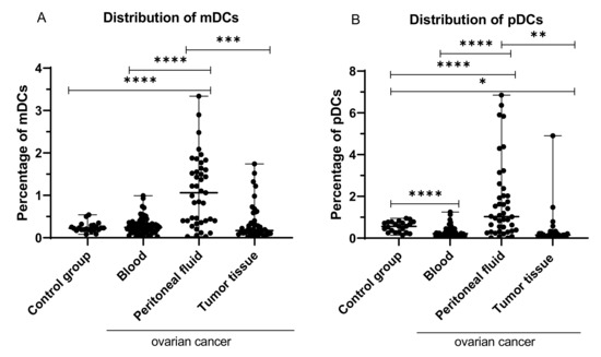 Similarly, the highest percentage of plasmacytoid (BDCA-2+CD123+) DCs was detected in the peritoneal fluid of the OC patients, and it was significantly higher than in PB (p < 0.0001; median 1.03% vs. 0.215%) and tumor tissue (p < 0.01; median 1.03% vs. 0.15%), than in PB of the control group (p < 0.0001; median 1.03% vs. 0.565%; Figure 1B).