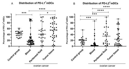 Percentage of BDCA-1+CD19− cells with PD-L1 (A) and PD-L2+ expression (B) in healthy blood donors and peripheral blood, peritoneal fluid, and among ovarian cancer infiltrating cells. The median value with the following marks indicate statistically significant differences: * p < 0.05, *** p < 0.001, **** p < 0.0001.