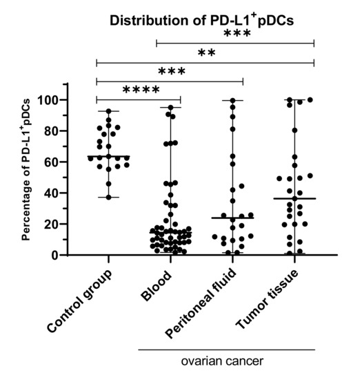 Percentage of BDCA-2+CD123+PD-L1+ cells in healthy blood donors and peripheral blood, peritoneal fluid, and among ovarian cancer infiltrating cells. The median value with the following marks indicate statistically significant differences: ** p < 0.01, *** p < 0.001, **** p < 0.0001.