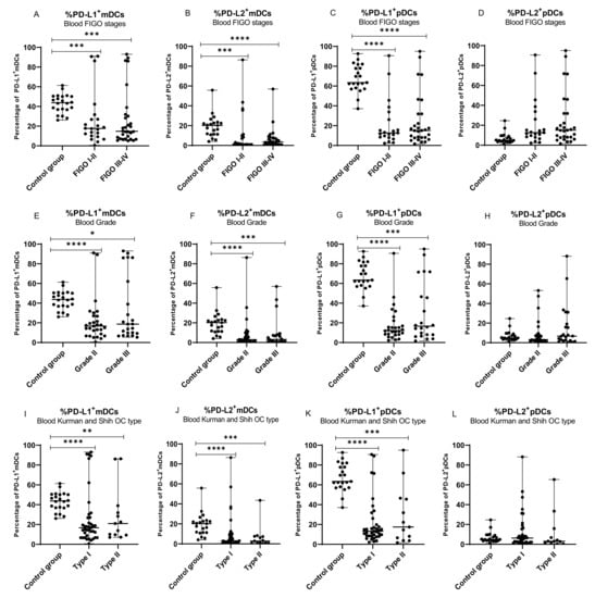 The percentage of pDCs with PD-L1 expression was lower in low (I/II) and advanced (III/IV) stages (both p < 0.0001; Figure 4C), grade II (p < 0.0001) and III (p < 0.001; Figure 4G), and type I (p < 0.0001) and type II (p < 0.001) of OC compared to healthy women (Figure 4K).