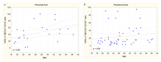 There was a positive relationship between BMI of the OC patients and the percentage of BDCA-1+CD19−PD-L1+ cells in PF (R Spearman: 0.458; t(N-2) 2.364, p < 0.05; Figure 5A). We also observed a positive relationship that tended to be significant between BMI of OC patients and the percentage of BDCA-2+CD123+PD-L1+ cells in PB (R Spearman: 0.266; t(N-2) 1.889, p = 0.06; Figure 5B).