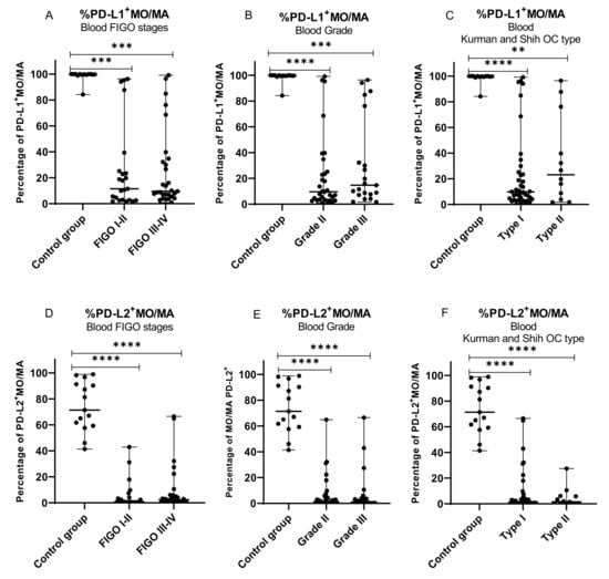 Distribution of MO/MA with PD-L1 and PD-L2 expression in peripheral blood of healthy blood donors and peripheral blood of ovarian cancer patients with different FIGO stages (A,D), grade (B,E), and OC types (C,F). The median value with the following marks indicate statistically significant differences: ** p < 0.01, *** p < 0.001, **** p < 0.0001.