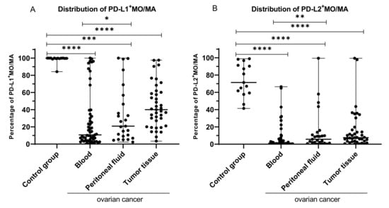 The difference in the distribution of PD-L1 (A) and PD-L2 positive MO/MA (B) in PB, PF, and TT of OC patients in comparison to healthy blood donors. The median value with the following marks indicate statistically significant differences: * p < 0.05, ** p < 0.01, *** p < 0.001, **** p < 0.0001.