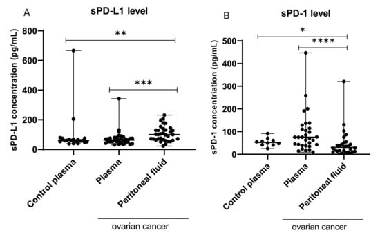 Levels of sPD-L1 (A; pg/mL) and sPD-1 (B; pg/mL) in the plasma of healthy blood donors, and the plasm and PF of patients with ovarian cancer. The median value with the following marks indicate statistically significant differences: * p < 0.05, ** p < 0.01, *** p < 0.001, **** p < 0.0001.