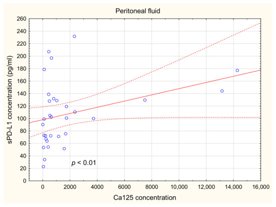 There was a positive relationship between the sPD-L1 level in PF and the Ca125 concentration in the plasma of the OC patients (R Spearman: 0.471; t(N-2) 2.875; p < 0.01; Figure 9).